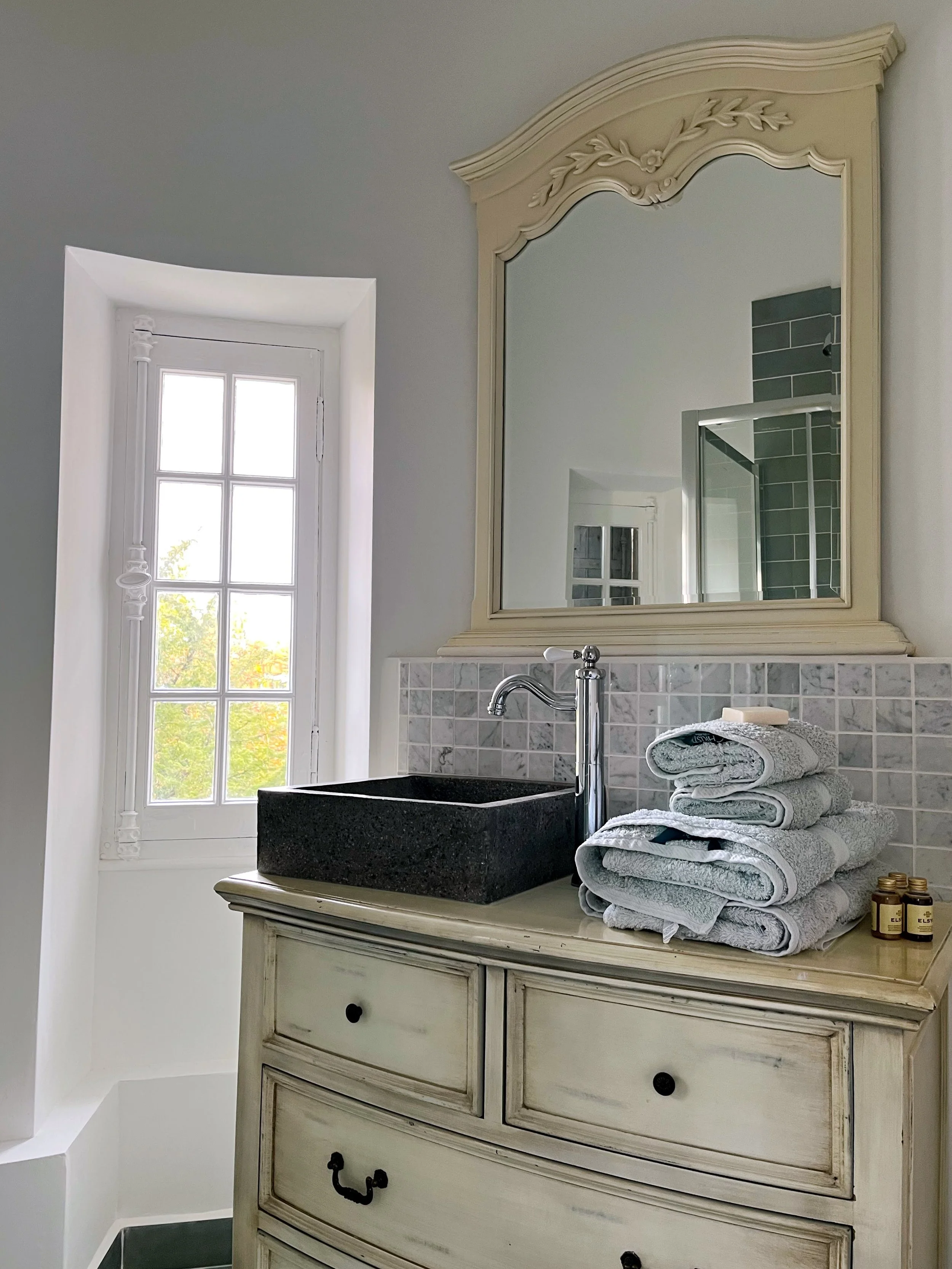 There are two large suites, each with its own private bathroom. Both face the South Terrace and parkland, with the enormous Sequioa trees and the view of Mount Cadres beyond. Opposite these suites you will find an upstairs salon which is available throughout your stay. This has a fantastic view over the garden and landscape beyond. There is a TV with an abundance of English Channels available, DVD’s, and Board games.